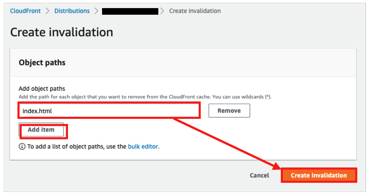 빈 칸에 캐시를 지우고자 하는 파일의 절대경로(/example.txt) 를 입력한다. 하단의 Add item 버튼을 통해 한 번에 여러 파일의 캐시를 지울 수도 있다. 캐시를 지우고 싶은 파일명을 모두 적었다면 Create invalidation 버튼을 클릭해주면 끝난다.