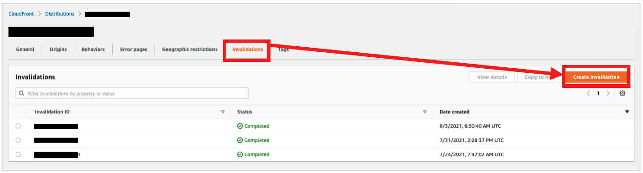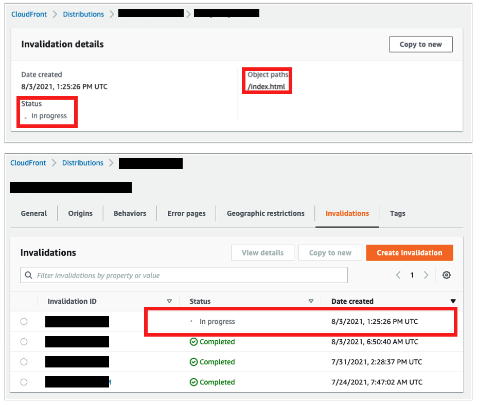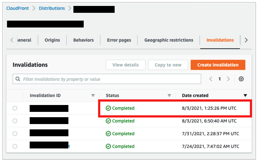 Invalidation 요청이 만들어지면 Status가 In progress 상태로 보인다. 곳곳의 엣지 로케이션에 퍼져있는 캐시 파일을 제거하는 것이므로, 다소 시간이 소요될 수 있다. (약 15~30분) Invalidation 요청이 모든 엣지 로케이션에 적용이 완료되면 Status가 Completed로 바뀐다.