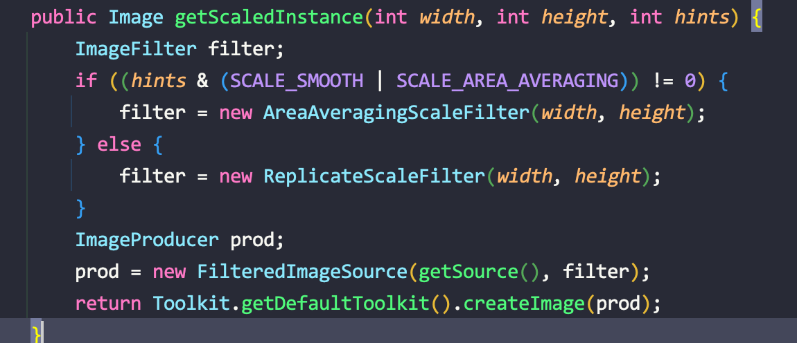 왜 이런 차이가 발생하는지 잘 모르겠다. getScaledInstance() 메소드 내부를 보니 SCALE_SMOOTH일 경우 AreaAveragingScaleFilter 즉 box filter를 사용하는 건데 그럼 앞에서 사용한 방법인 VALUE_INTERPOLATION_BICUBIC 이 이미지 퀄리티가 더 좋아야 정상이다.