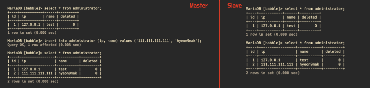Master 서버 쪽에 데이터를 추가하면 Slave 서버 쪽에도 곧장 반영되는 것을 확인할 수 있다. 위와 같이 출력될 경우 연결에 성공한 것이다. 곧바로 Springboot Datasource 설정을 진행하자.