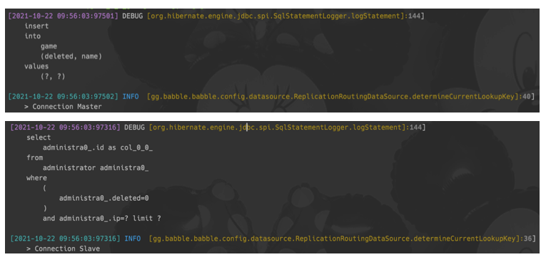 설정을 모두 마쳤으면 애플리케이션을 실행해보자. 다른 이슈가 없다면 정상적으로 서비스가 진행되며 로거를 통해 Master/Slave 데이터베이스를 번갈아서 사용하고 있음을 확인할 수 있다.