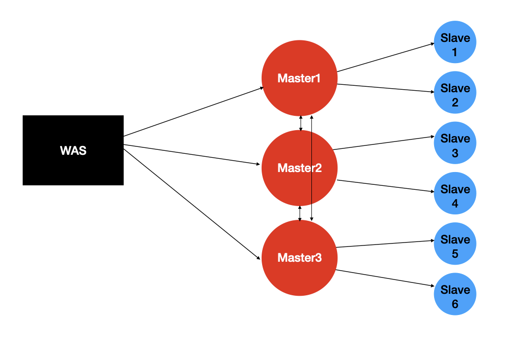 현재 글에서 구성된 Master:Slave 는 1:N으로, Master 서버가 1개인 상황을 가정하고 Slave는 컬렉션으로 관리하는 형태의 Replication이 구성되어 있다. 이 때 ‘왜 Master는 1개여야 하지? Master도 여러개 준비하고 컬렉션으로 관리하면 안되나?’ 라는 생각이 들었고, 아래 그림과 같이 Master와 Master 간에도 서로 복제 관계를 가지는 것을 생각했다.